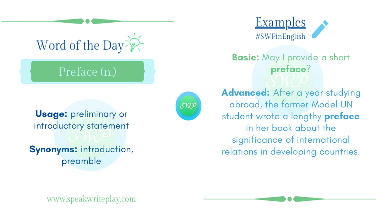 The preface is one of the integral parts of your books front matter. Preface in American English ˈprefɪs verb -aced -acing noun 1. Kester Author April 2013.